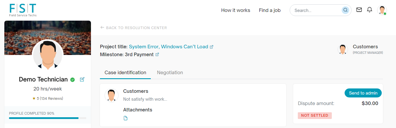 After disputing the payment, the customer can negotiate the amount with you in the negotiation section. If you are not happy with the outcome, mark the dispute as NOT SETTLED. Then click on the ‘Send to admin’ option. Afterward, the dispute will be escalated and handled by the FST admin. The administrator will assist in mediating to achieve a mutually agreeable solution for you and the customer.